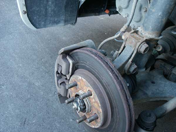 We have a first look at our brakes. Now is a good chance to inspect our brakes and check for any leaks etc. Inspect your caliper, hoses and fittings. Here is a look at the brakes from the side. Although the break pad looks fairly good let’s wait and see what it looks like on the other side of the brake disc. We also inspect our break disc - run your finger across the disc and feel for any grooves. (picture 4)