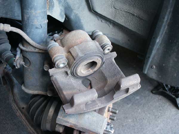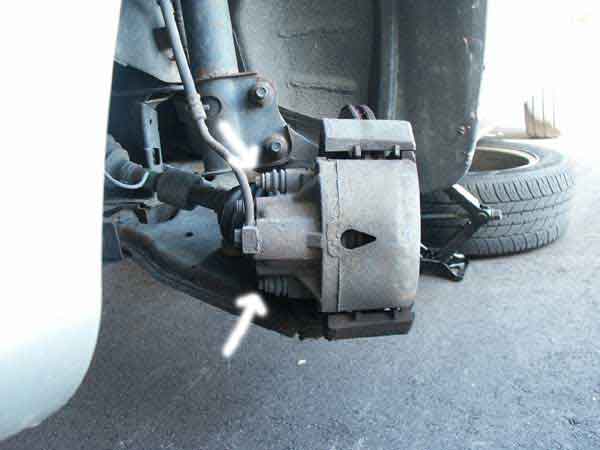 In this model of 2000 Chrysler Neon it looks like removing the cylinder will be a quite an easy task. brakes are held in place by 2 bolts indicated by the arrows (lower guide pins). These usually are 10-mm allen head or hex-head bolts. (picture 5)