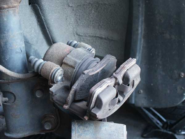 After taking the bolts off we position the cylinder on top of the disc brake. You must be careful as the whole unit can be fairly heavy and we do not want to damage brake line which is still connected to the unit. The reason why we did not remove the break line is so we would not have to bleed the brakes at the end of this task. We are now ready to remove old break pads. These are usually held in place by metal spring hinges and can be easily removed (snapped off). (picture 6)